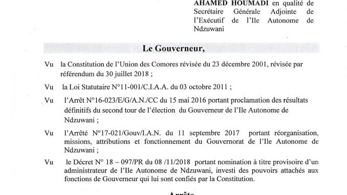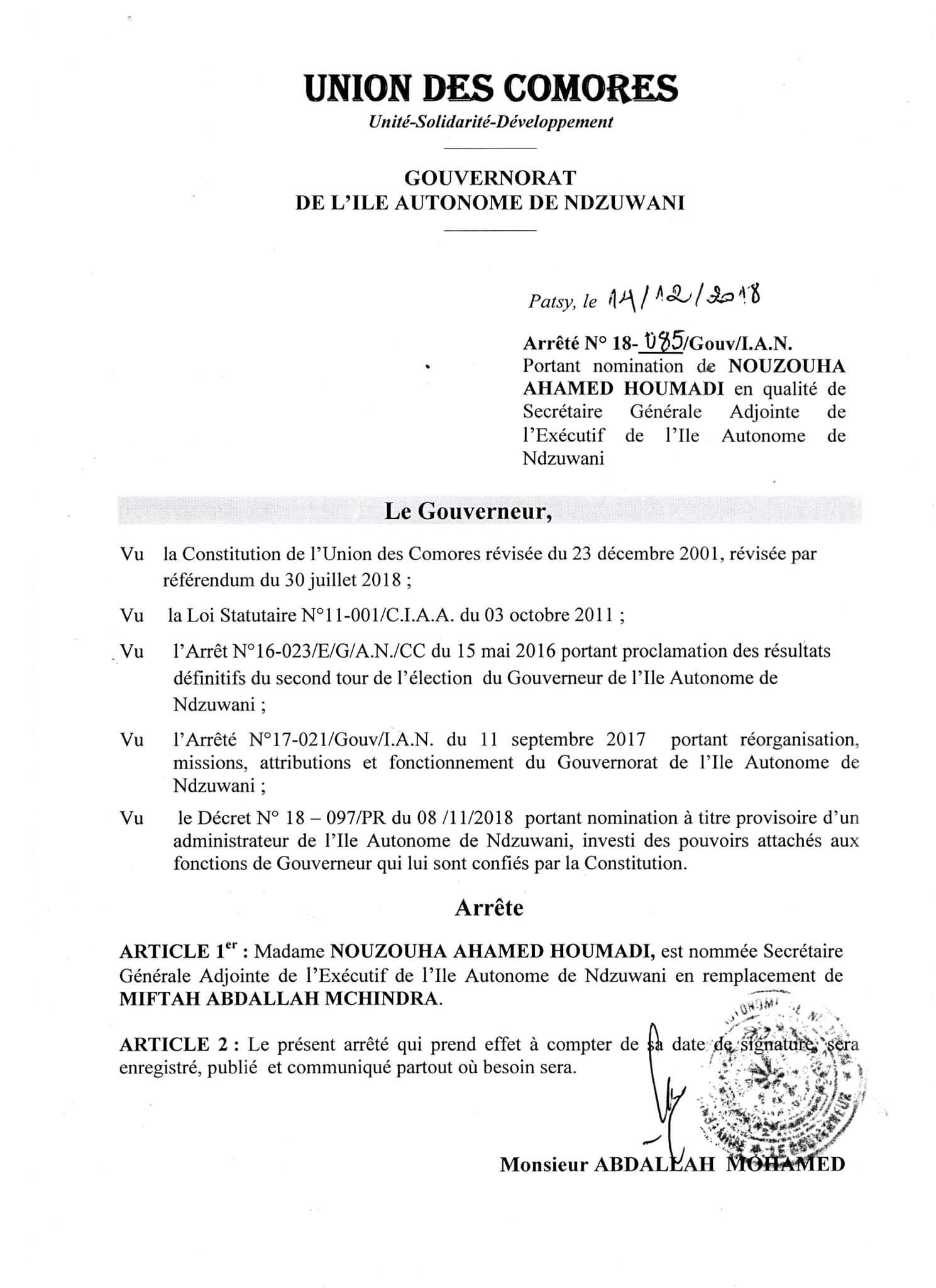 Arrêté N°18-085 du 14 décembre 2018, portant nomination de NOUZOUHA AHMED HOUMADI en qualité de Secrétaire Générale Adjointe de l’Exécutif de l’Île Autonome de Ndzuwani.