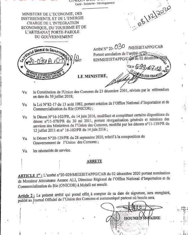 Nommé le 2 décembre, directeur régional de l’Onicor à Mohéli, par le Ministre de l’économie, il est viré le 8 décembre par le même ministre.