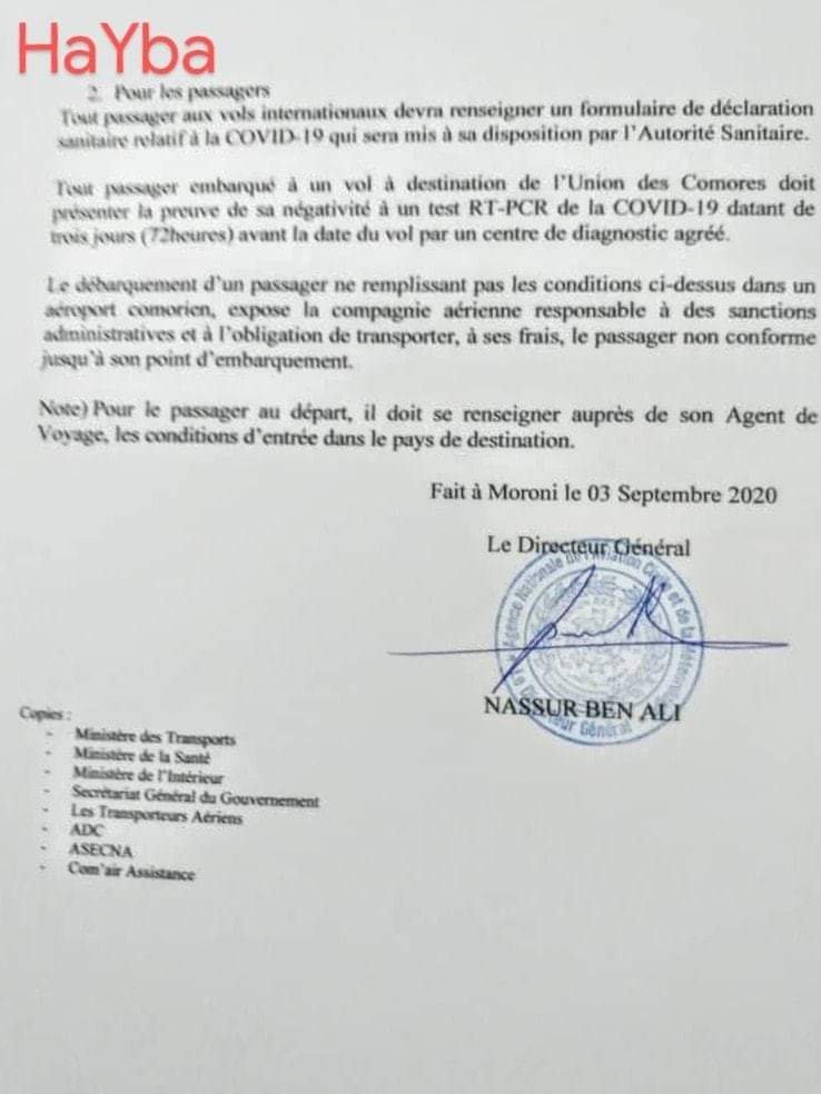 Note circulaire de l’Aviation civile comorienne sur les dispositions préalables à prendre par les voyageurs et les transporteurs avant les vols au départ et à l’arrivée.