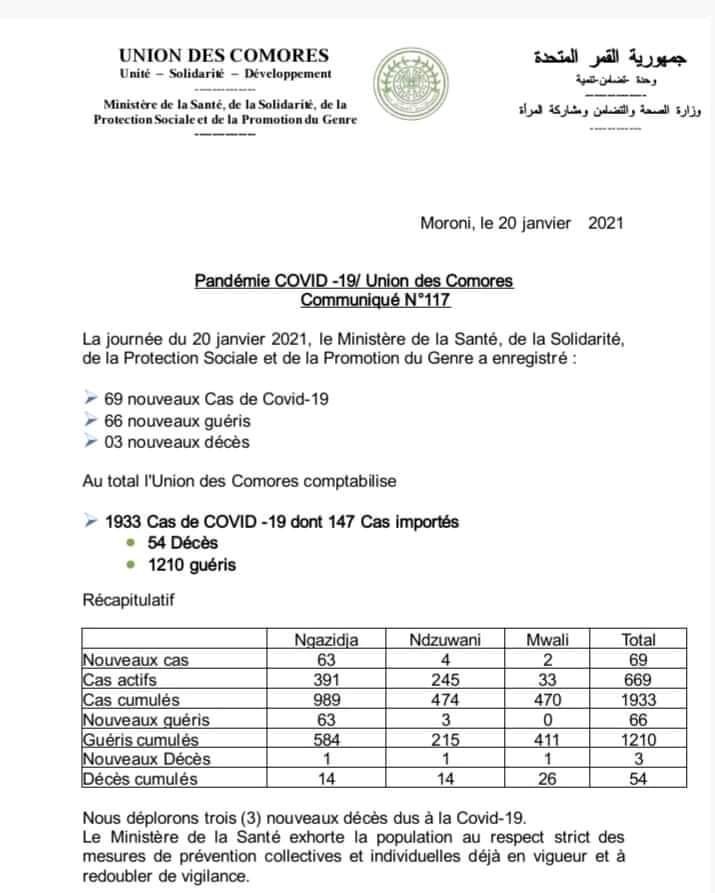 Le nombre de cas positif continue d’augmenter surtout à la grande Comores. Sur les 66 nouveaux cas positifs recensés aujourd’hui, 63 sont enregistrés à Ngazidja, 4 à Anjouan et 2 à Moheli, selon le nouveau bulletin de santé sorti par le ministère de la santé.