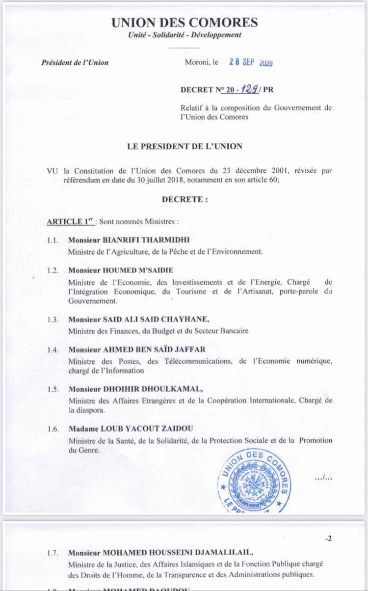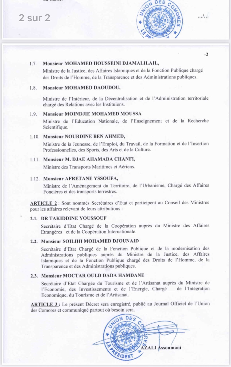 L’ancien vice-président de l’assemblée nationale, cheville ouvrière du fameux rapport sur la citoyenneté économique, a succédé à Amine Souef aux affaires étrangères. Djae Ahamada Chanfi a pris les commandes des transports aériens et maritimes. Aucun membre du gouvernement n’est remplacé à part bien sûr Souef qui a démissionné depuis deux mois.