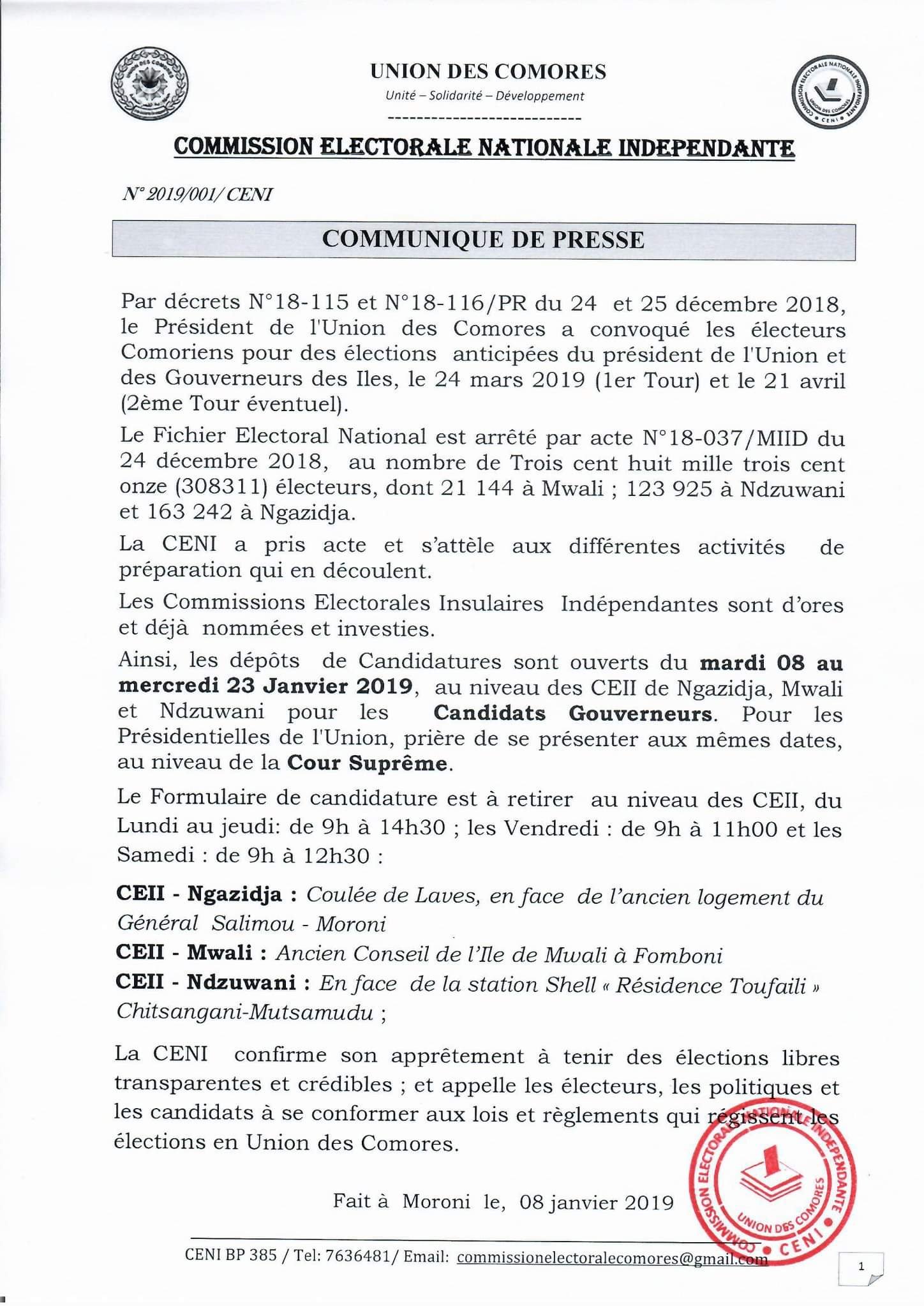 Comme décrété par le président de l’Union des Comores, ce 8 janvier 2019 dans les différentes CEII et à la Cour Suprême, les dépôts de candidatures sont ouverts jusqu’au 23 janvier 2019, pour les candidats à la présidence de l’Union et au Gouvernorats des Iles.