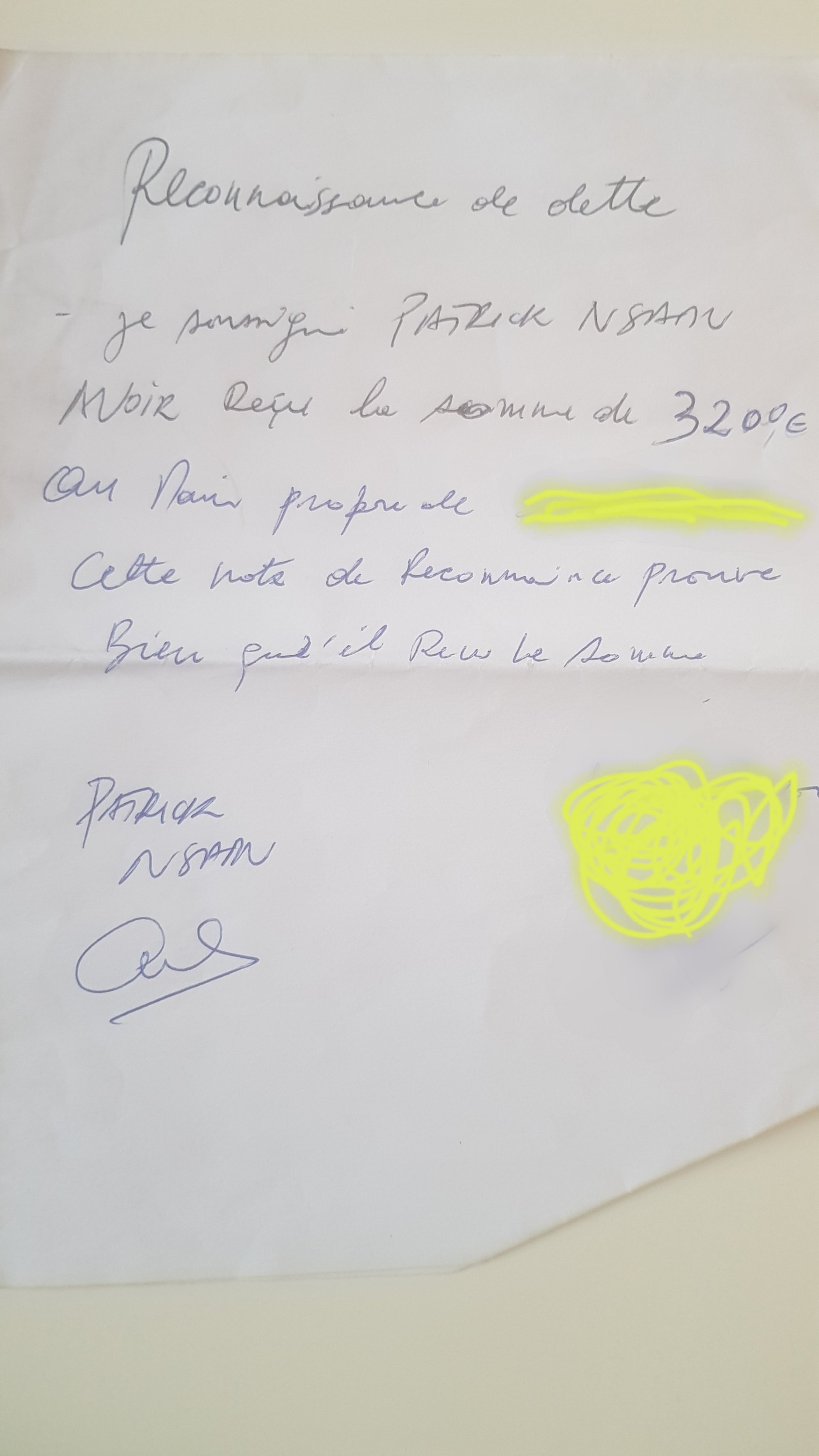 Il s’appelle Patrick Nsamu kiabanza c’est un escroc qui refuse catégoriquement de rembourser ses dettes. Il est originaire du Congo, âgé d’une cinquante d’années, il habite en région parisienne et une de ses victimes est comorienne. Patrick sait épater ses victimes qui sont souvent dans des besoins administratifs. Il dit aux victimes qu’il est un ancien militaire, qu’il a des contacts à la préfecture, des amis hauts placés. Il promet des documents(papiers, permis…… »sous préfecture ») Ci-dessous un document écrit par lui même :