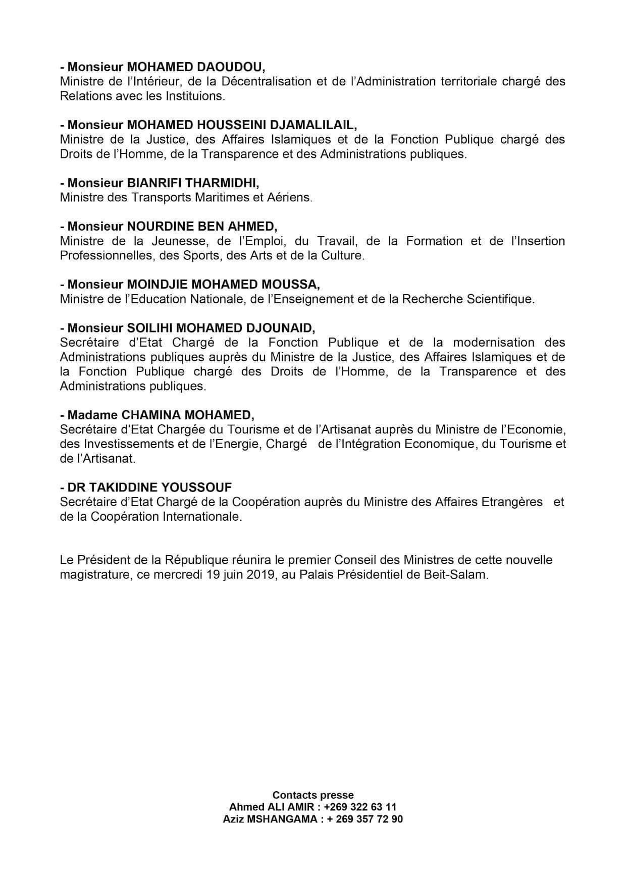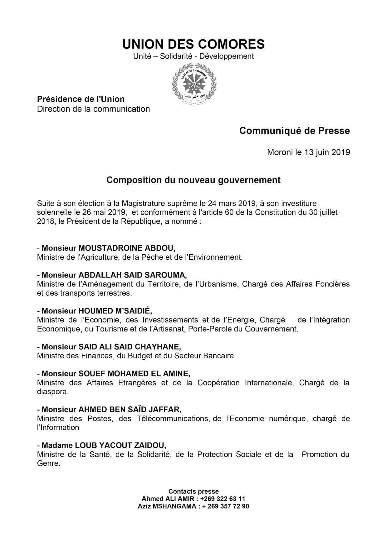 Vu la Constitution de l’Union des Comores du 23 décembre 2001, révisée par référendum en date du 30 juillet 2018, notamment en son article 60, le Président de la République, par le décret N°19-058/PR a nommé un nouveau gouvernement.