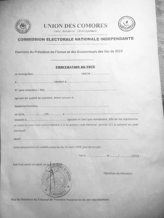 À quelques heures du double scrutin prévu dimanche 24 mars, l’opposition comorienne a appris avec stupéfaction l’existence de 900 formulaires de procuration de vote pré-signés par le président du tribunal de première instance de Moroni et délivrés au pourvoir sortant.