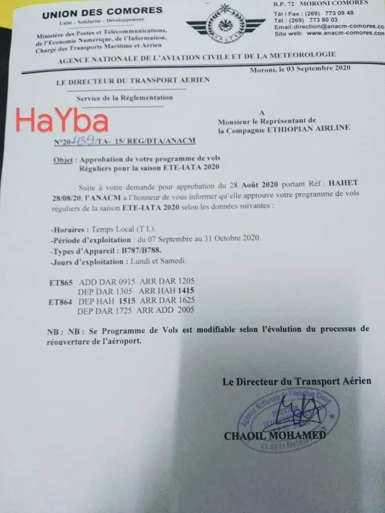 Voici le programme de Vol d’Ethiopian Airlines jusqu’au 31 octobre, une information de nos confrères de Hayba Fm.
