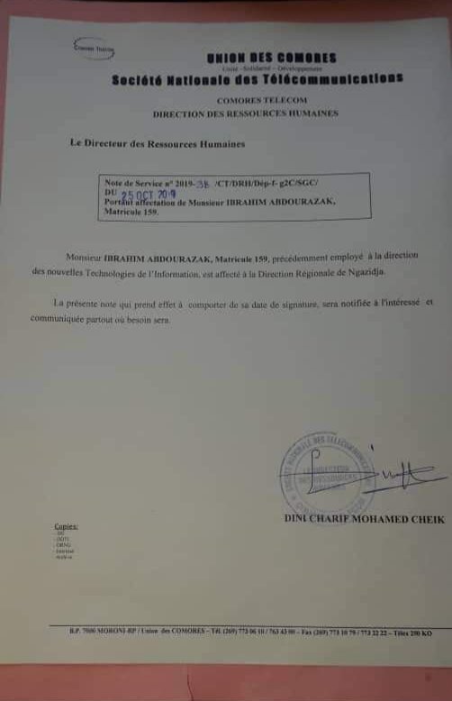 Très actif sur le mouvement des grévistes de la société Comores Télécom, Abdourazak alias Razida vient d’être affecté à la direction régionale de Ngazidja sise au nord de la grande Comores, Mitsamihuli. Une mesure prise à son encontre à cause de son implication sur la grève déclenchée récemment à Comores Télécom.