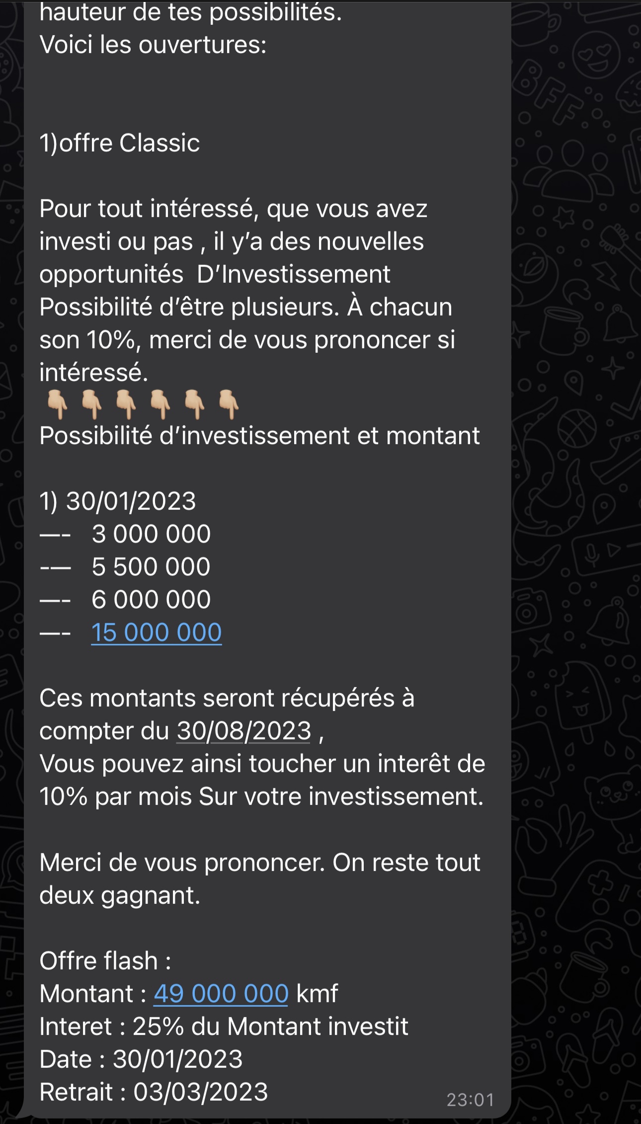 La première opération, dénommée « Offre classique », proposait aux clients un pourcentage mensuel de 10% du montant versé. Dans son message classique envoyé à ses proies, Nazra Said Hassani précisait : « A chacun son 10%, merci de vous prononcer si intéressé ». Les montants investis allaient de 3 à 15 millions de francs comoriens.