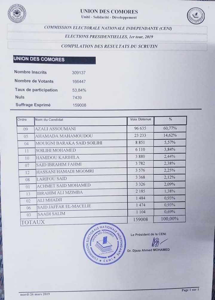 Résultats provisoires : Deux après les élections, la CENI vient de publier les résultats depuis le palais du peuple qui est sous haute surveillance. Le candidat Azali Assoumani est réélu président. Sur les voix exprimées et comptabilisées par la CENI, Azali serait réélu avec 60,77% des suffrages exprimés.