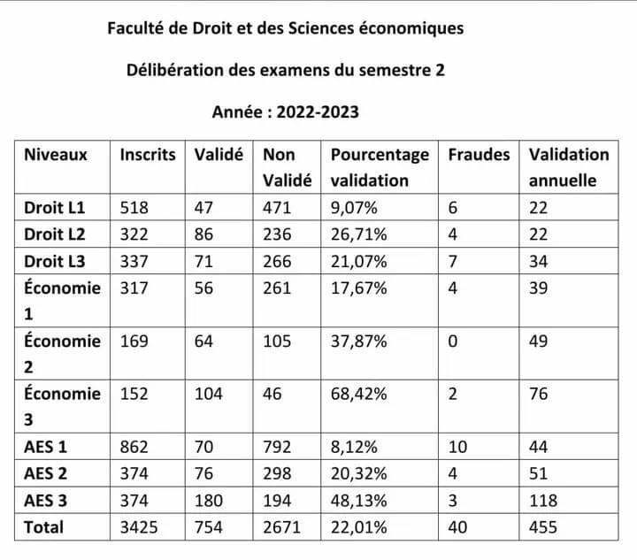 Sur un total de 3425 étudiants inscrits, seuls 757 ont réussi à valider leurs examens, ce qui représente un pourcentage alarmant de 22,01% de réussite. Ces chiffres témoignent d’un échec massif et soulèvent des inquiétudes quant à la qualité de l’enseignement dispensé au sein de la faculté.