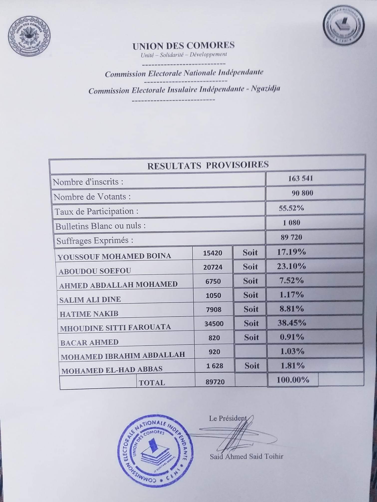 Résultats Provisoires 1er Tour des Gouverneurs de NGAZIDJA: