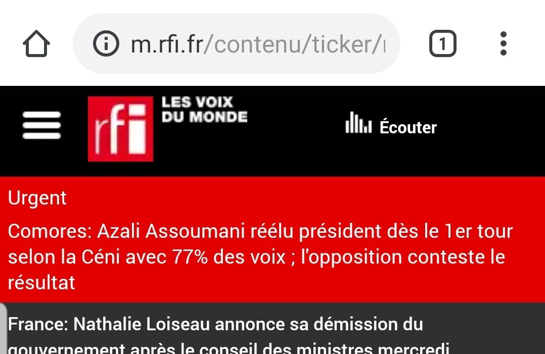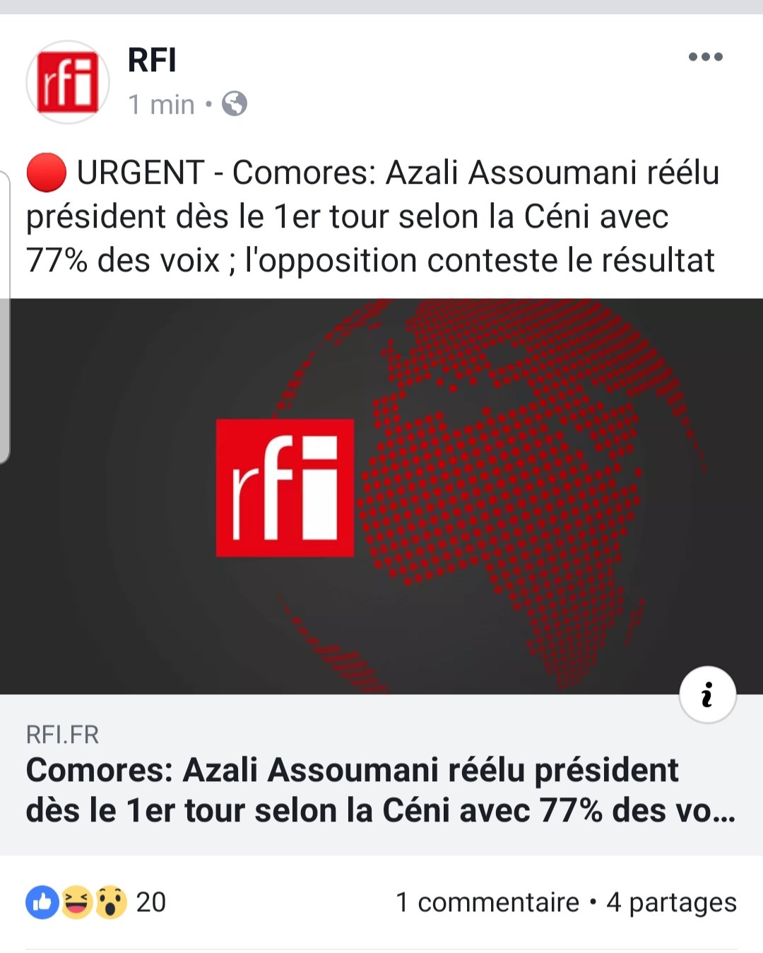 La radio France Internationale vient de publier des résultats qui sont faux. RFI se moque t-il de la victoire d’Azali? Azali aurait gagné avec 77% des voix.