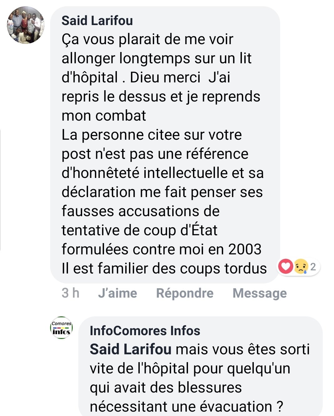 La photo du candidat malheureux à l’élection continue d’étonner les spécialistes. Comment un homme déclaré gravement blessé a t-il retrouvé une forme d’un athlète en arrivant en France ? Houmed Msaidié avait déclaré que Said Larifou est un grand comédien.