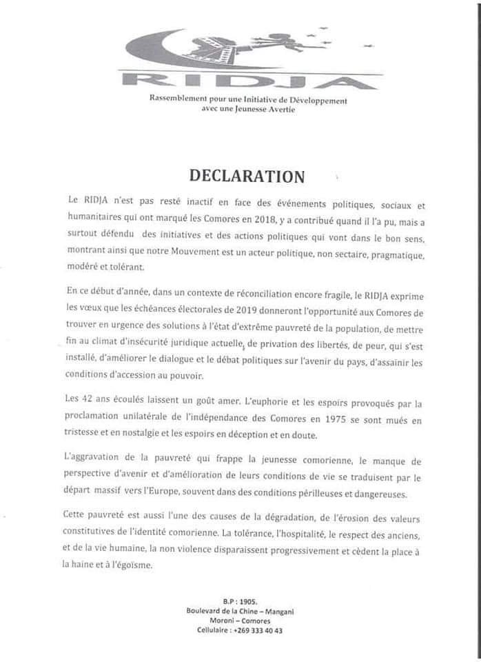 Il est encore Naïf ce LARIFOU , grandement fou, un abrutis de 1 er ordre , à la limite de malade mental qui change de veste et de couleur comme un Caméléon , il ne voit pas qu’il n’ a aucune chance de gagner à ses élections lui et l’ opposition Comorienne . Ces élections seront qu’une formalité pour AZALI car les urines de ces présidentiels de Mars et Avril 2019 sont déjà remplis des bulletins d’ Azali et scellés , les procès verbaux sont déjà signés . Il ne reste plus que les jour J pour les dépouiller . Le score est déjà connu d’ avance , Le dictateur AZALI l ‘ emportera haut la main avec 75% de voix . Le peuple Comoriens participera avec un taux de 104% à la Djaza .