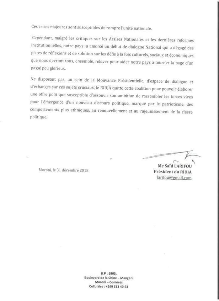 1 commentaire sur Said Larifou claque la porte, quitte la mouvance présidentielle et Azali
