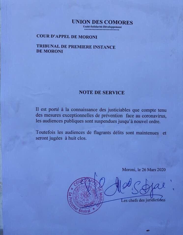 Said Tocha, le juge chargé de l’affaire, fait tenir une audience mercredi 1er avril alors que toutes les audiences publiques sont suspendues par une note des chefs de juridictions à cause des mesures de prévention contre l’épidémie de coronavirus (document ci-dessous). Ils ont même pas pris la peine de convoquer ni la partie civile, ni les deux avocats de la partie civile. Tout ça pour qu’ils puissent libérer les violeurs. Pris au dépourvu, Me Moudjahidi, un des avocats de la victime, juge ce procédé « inconcevable » et par conséquent, ne compte pas se présenter au tribunal lors du délibéré prévu pour ce samedi 4 avril.