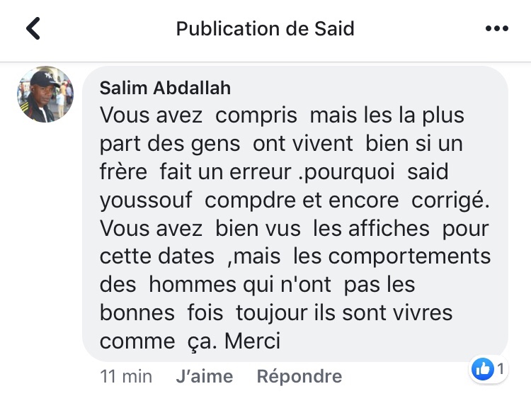 Cette méprise pour ne pas dire ignorance lui a valu une pluie de commentaires moqueurs des internautes. Et la faute, retenez bien, n’est pas à son auteur mais…à Said Youssouf qui, dépourvu de bonne foi selon Salim, a repris le post en question. Courroucé par ce qu’il considère à juste titre comme un acharnement, Salim monte (enfin !) sur ses grands chevaux et répond vertement à Said Youssouf. Une réponse bien soignée à la hauteur de son auteur.