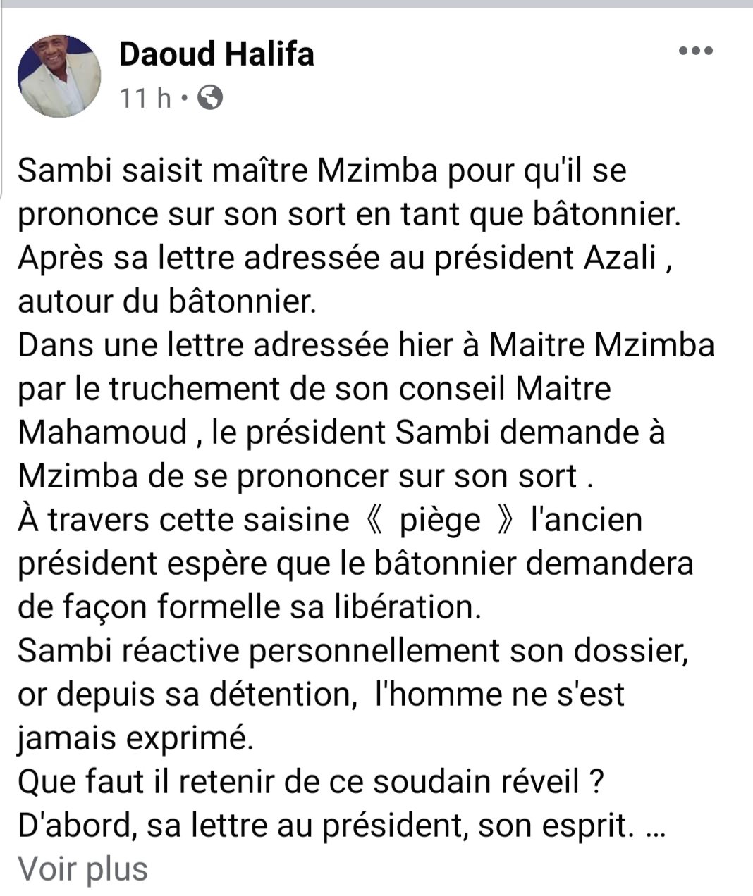 Il fallait absolument qu’il le fasse. Daoud Halifa a sorti le plus gros mensonge aujourd’hui. Il a affirmé que l’ancien président Ahmed Abdallah Sambi a adressé une lettre à Maître Ibrahim Ali Mzimba mais c’est un gros mensonge. C’est honteux qu’à son âge Daoud Halifa invente des mensonges. Un proche de Sambi souhaitant rester anonyme nous a fait savoir que cette information est complètement fausse et sans fondement. Et bien sûr cette lettre ne sera jamais publiée puisqu’elle n’existe pas. Daoud Halifa est un proche d’Azali qui est prêt à tout…