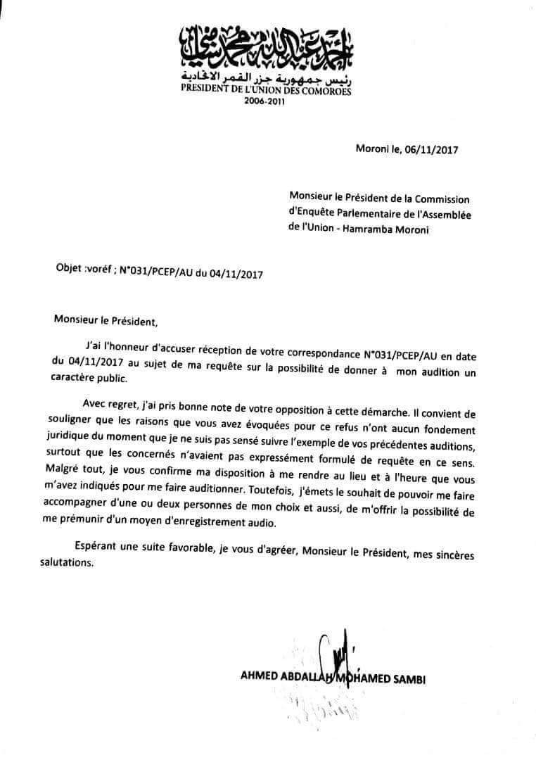 L’ancien président Abdallah Sambi convoqué pour une audition sur la citoyenneté économique a répondu favorable à la demande de la commission parlementaire. Il souhaite toute fois être assisté par un proche et pouvoir enregistrer l’entretien.