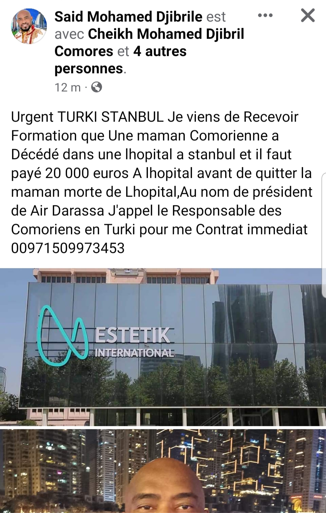 Le Youtubeur, influenceur Djibril a annoncé que le corps d’une maman comorienne morte à l’hôpital en Turquie est bloqué à l’hôpital et ne pourra pas être restitué à la famille pour l’enterrement sans le paiement de 20 000 euros. Le Youtubeur n’a pas précisé le village ou la ville de la femme décédée. Il a lancé un appel à être contacté.
