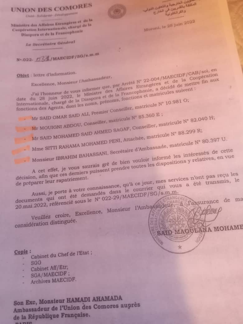 L’ambassadeur par intérim des Comores à Paris, Abdou Mouigni, se trouve dans une situation d’illégalité selon une note officielle du ministère des Affaires étrangères. Bien que n’étant plus employé du ministère depuis le 28 juin 2022, il continue de travailler à l’ambassade en tant que conseiller, soulevant des interrogations quant à sa légitimité à occuper le poste d’ambassadeur par intérim.
