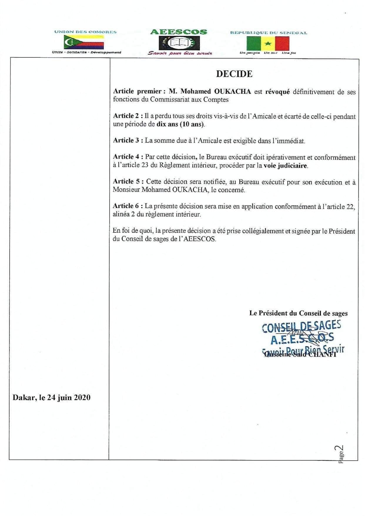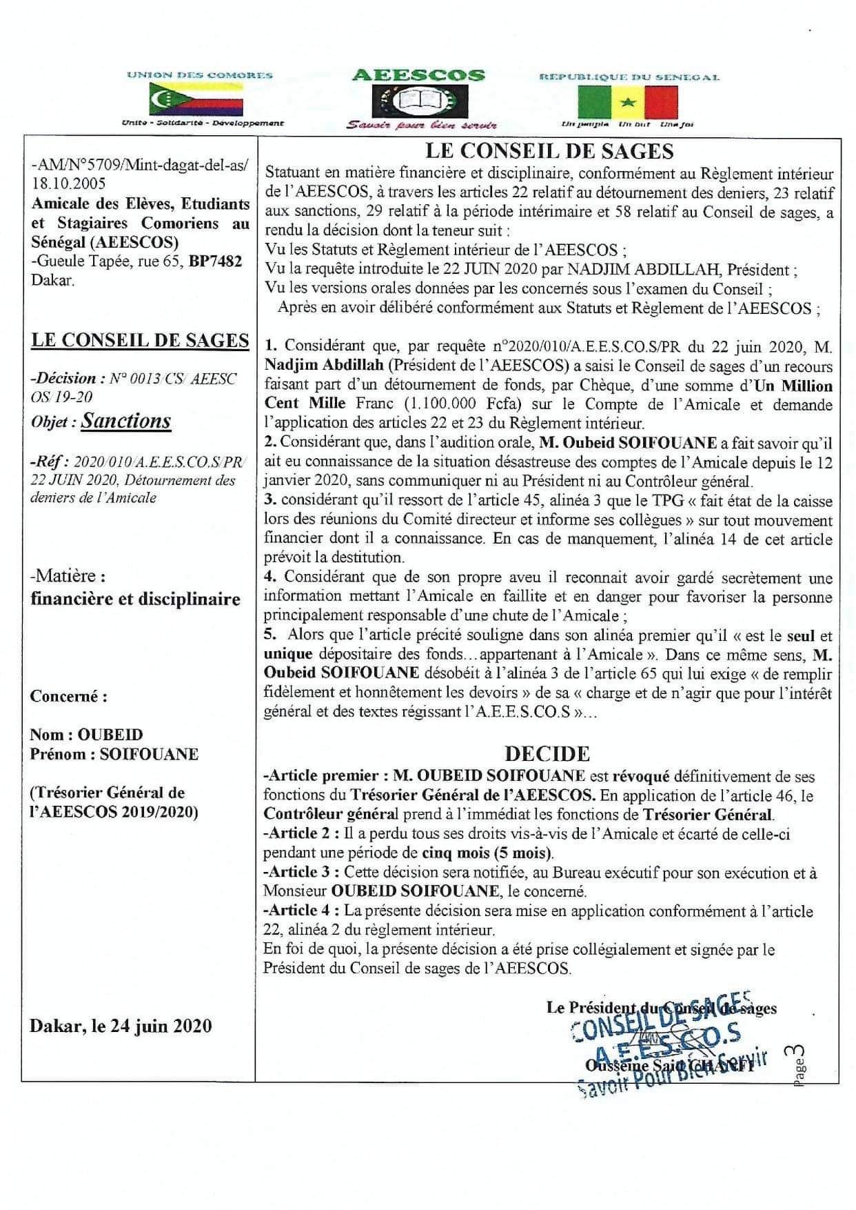 Oubeid Soifoine a reconnu avoir volé dans les caisses de l’association des étudiants Comoriens au Sénégal. Il était le trésorier de l’Aeescos depuis quelques années. La somme détournée par Oubeid Soifoine est estimée à plus d’un million CFA. Il ne serait pas le seul. L’association compte saisir la justice sénégalaise dans cette affaire.