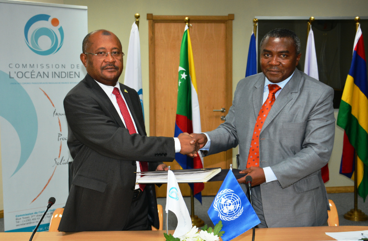 Ebène, Maurice le 14 décembre 2016 – Madi Hamada, Secrétaire général de la Commission de l’océan Indien (COI) et Patrice Talla, Représentant de la FAO pour Madagascar, Comores, Maurice et Seychelles, ont signé ce jour un accord de coopération technique en vue de la mise en œuvre du Programme régional de sécurité alimentaire et nutritionnelle (PRESAN) adopté par la COI en février 2016.