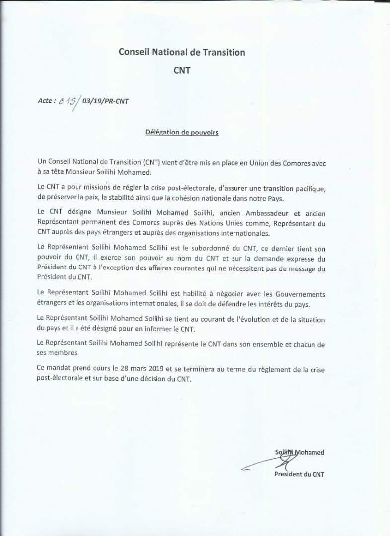 L’ancien ambassadeur des Comores et Représentant permanent des Comores auprès des Nations Unies, Soilihi Mohamed Soilihi, est désigné comme représentant du Conseil National de Transition auprès des pays étrangers et organismes internationaux.