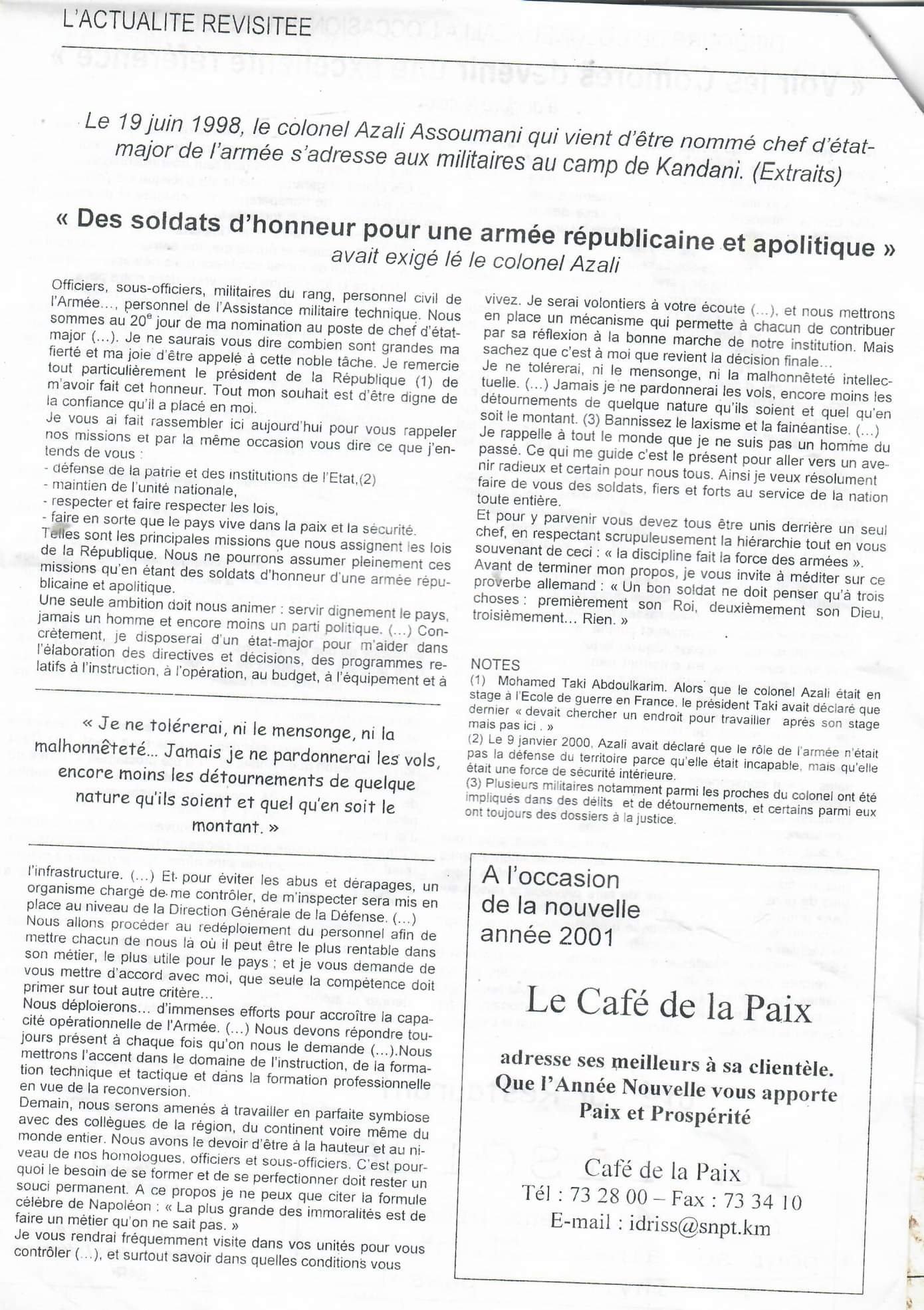 Le président Mohamed Taki ne voulait pas d’Azali au sein de l’armée nationale. « Après son stage il devra trouver un autre endroit pour travailler » aurait déclaré Taki, il y a 21 ans. Avait-il eu une vision ou une bonne intuition du colonel Azali? Qui a forcé Mohamed Taki à nommer Azali chef de l’état major ? Lisez le journal ci-dessous et remontez le temps il y a 21 ans.