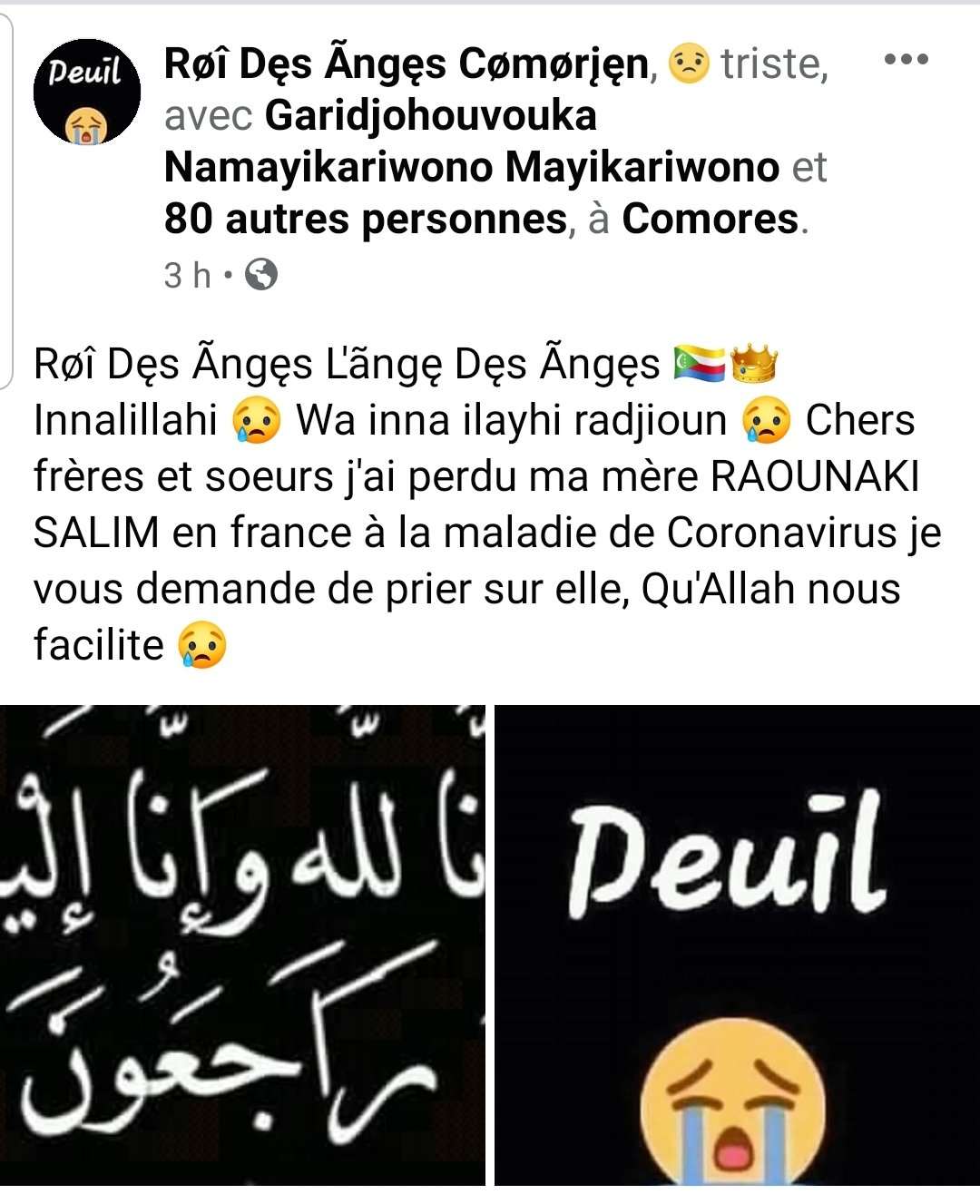 Un comorien vivant en France a perdu sa maman du coronavirus. Un témoignage qui sauvera des vies. Ce témoignage montre que personne n’est à l’abri. Le coronavirus n’est pas une maladie de la honte. C’est une épidémie qui touche tout le monde et nous devons appliquer les gestes barrières. Ce lundi Cheikh Mc a brisé le silence aux Comores. Nous appelons nos lecteurs à faire un douan à cette maman.