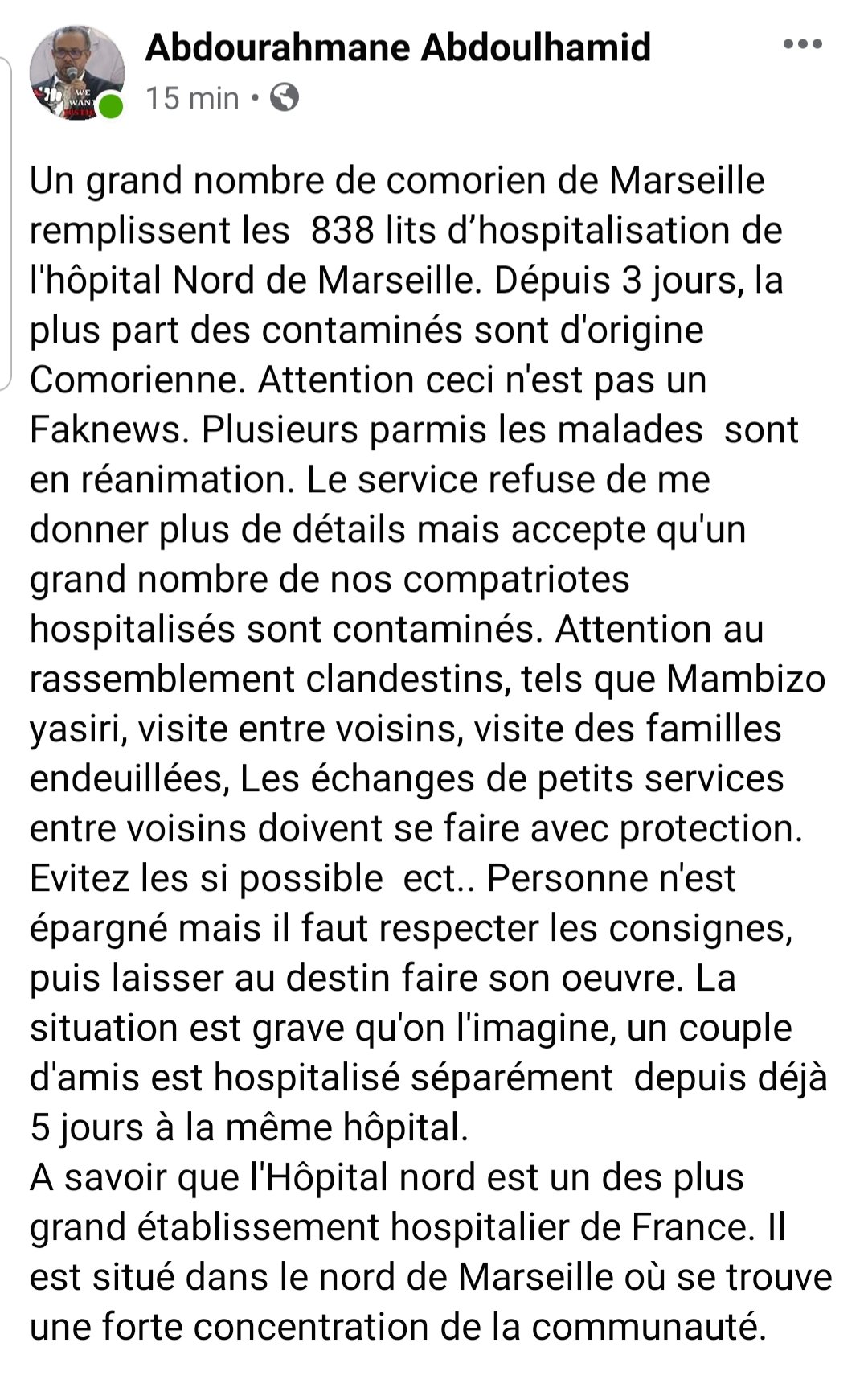 Le coronavirus touche la communauté comorienne de la diaspora. Voici le témoignage d’un journaliste de l’ortc à Marseille.