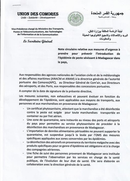La vice-présidence en charge des transports vient de sortir une note relative aux mesures d’urgence à prendre pour prévenir l’introduction de la peste qui sévit actuellement à Madagascar. Toutes les agences aéroportuaires du pays sont concernées et il s’agit de suspendre le trafic des petits bateaux en provenance de Madagascar transportant des marchandises alimentaires.