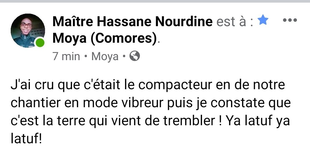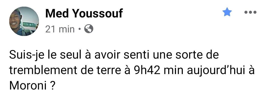 Ce matin plusieurs personnes dans les 3 îles aux Comores ont ressenti un tremblement de terre d’une très faible magnitude selon les témoignages. La secousse a eu lieu vers 9h42 selon le journaliste Mohamed Youssouf.