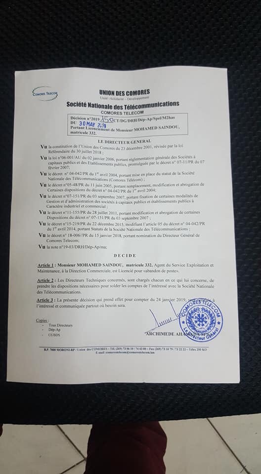 Ahmed Kiko (Mohamed Saindou de son vrai nom), un agent d’exploitation de Comores Télécom est mis à la porte. La décision est tombée aujourd’hui lundi. La motivation officielle mentionnée dans la décision est « abandon de poste ». En réalité il n’en est rien. Le mis en cause se présente assidûment sur son lieu de travail. Le surnommé Kiko n’est pas du genre à avoir sa langue dans sa poche. Il dénonce haut et fort ce qui lui semble contraire à la bienséance. Que ça soit de son village Mitsamiouli ou de l’entreprise qui l’emploie comme agent d’exploitation. Il y a quelques jours il s’en est vertement pris au directeur général de Comores Télécom Archimed. Ce dernier n’a pas attendu longtemps pour se débarrasser de ce rebelle qui est déterminé à « dénoncer davantage » maintenant qu’il est dehors. « J’ai osé dénoncé quand j’étais encore employé de Comores Télécom. Ca n’est pas maintenant que je suis dehors que je vais me taire », a-t-il prévenu dans une vidéo tournée en direct sur sa page Facebook.