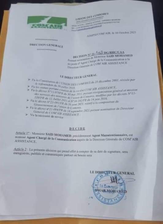 C’est une nomination historique. Quand l’ignorance est récompensée. Said Mohamed vient d’être nommé comme agent chargé de la communication de Com’Air. Combien de diplômés sont-ils actuellement au chômage aux Comores ? Combien ont-ils fait des études de lettres , de Communication et de droit ?
