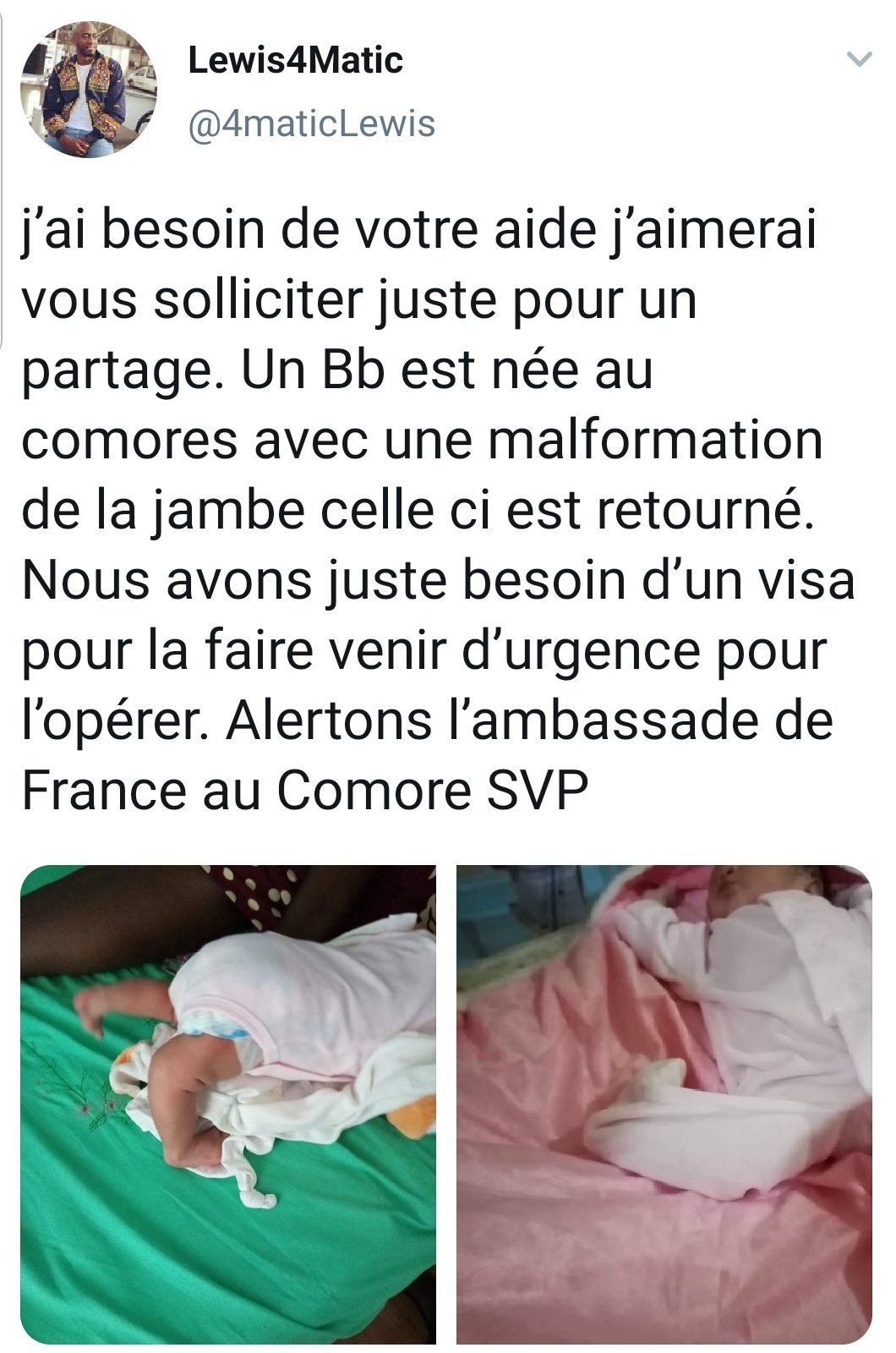 L’enfant aurait besoin de soins pour qu’il puisse marcher. La famille du bébé a besoin de Visa pour que le bébé puisse être soigné correctement en France puisqu’aux Comores les médecins sont incapables de le soigner.
