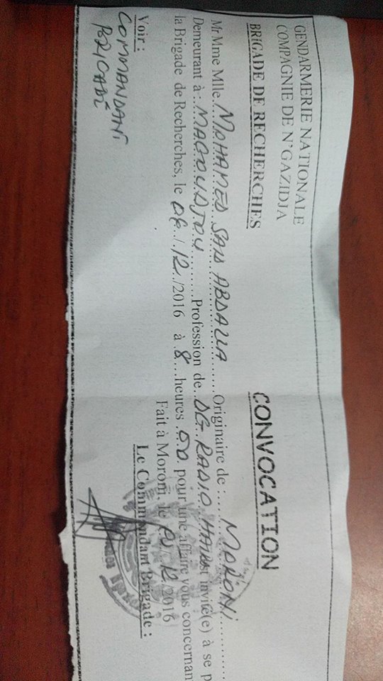 « Rasida Ibrahim Abdourazak est en garde à vue. Nono vient d’être entendu et relâché » a déclaré Said Mchangama