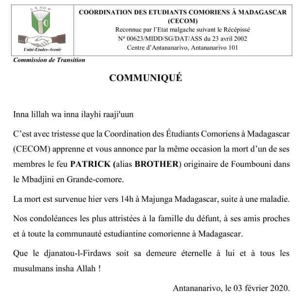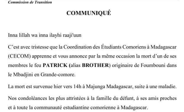 Un comorien est mort à Madagascar annonce l’association étudiante