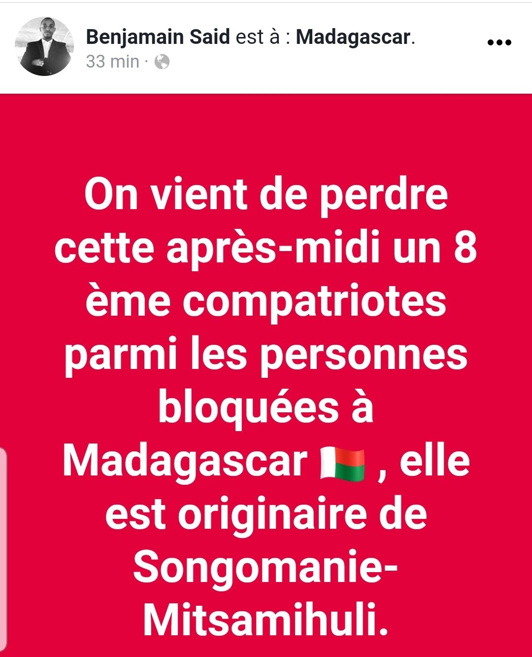 Depuis plusieurs semaines les Comoriens bloqués à Madagascar demandent à rentrer aux Comores mais les autorités comoriennes n’ont toujours pas données le feu vert malgré que la compagnie Air Madagascar est prête à ramener les Comoriens. Un des Comoriens est décédé comme le rapporte Benjamain said sur Facebook.