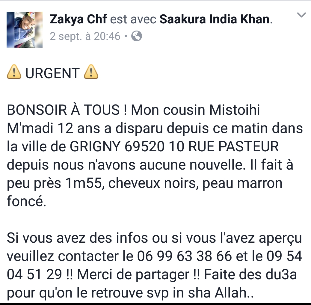 Un enfant âgé de 12 ans originaire des Comores a disparu comme le rapporte nos confrères de leprogres.fr. Il s’appelle M’madi Mistoihi.