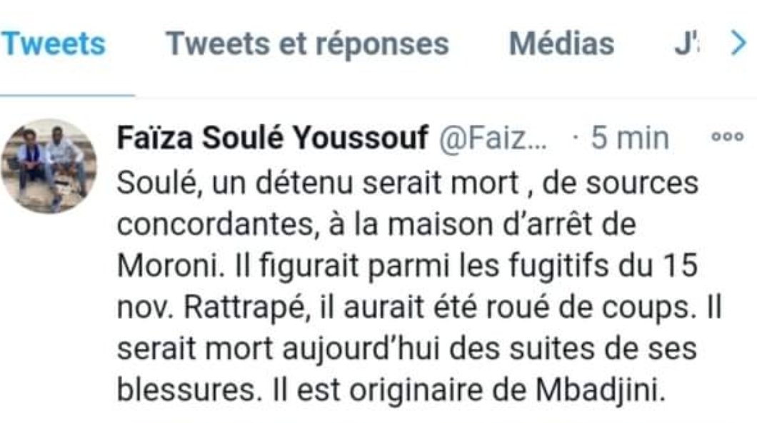 « Un détenu serait mort, de sources concordantes, à la maison d’arrêt de Moroni. Il figurait parmi les les fugitifs du 15 novembre. Rattrapé, il aurait été roué de coups. Il serait mort aujourd’hui des suites des suites de ses blessures. Il est originaire de Mbadjini » , Faiza Soule sur Twitter.
