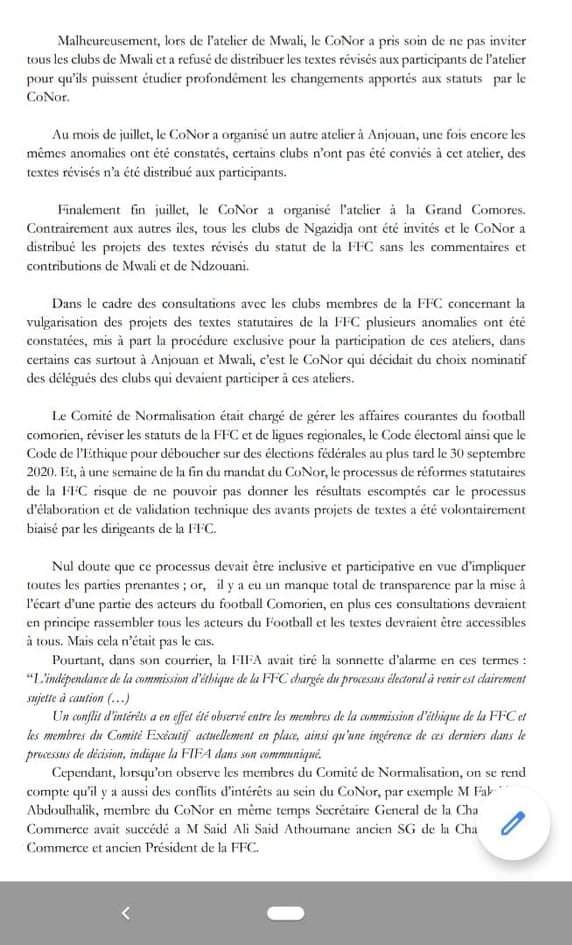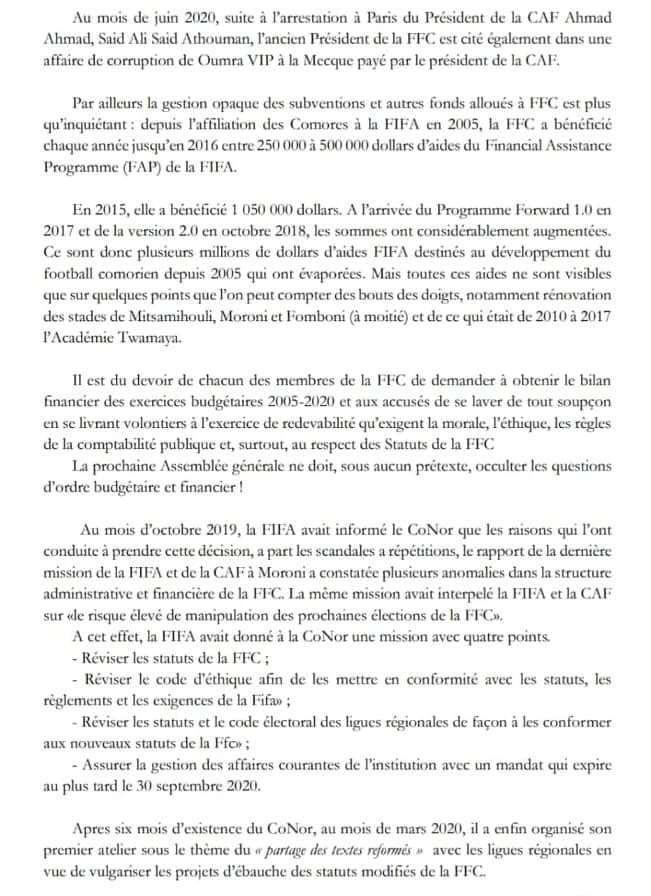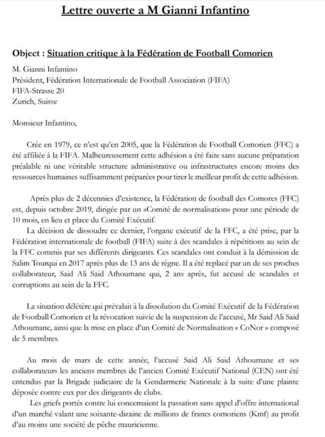 Un groupe de supporters de l’équipe nationale des Comores écrit et adresse une longue lettre au président de la FIFA { haute instance dirigeante du football mondiale } pour lui expliquer la situation critique qui secoue la fédération de football des Comores ( FFC ), surtout la gestion chaotique du comité de normalisation.
