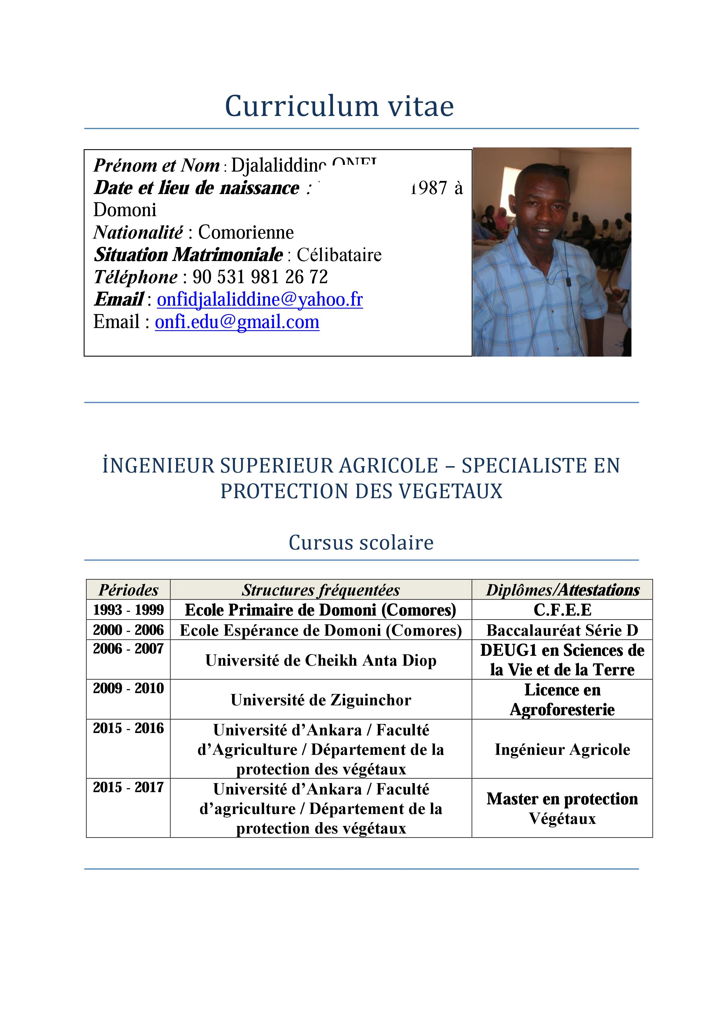 Djalaliddine ONFI est un jeune comorien surdoué. Son Cv et son parcours sont impressionnants, les responsables de l’Université d’Ankara l’ont vite compris. Djalaliddine est actuellement forcé par les responsables du département de recherche de l’Université d’Ankara à rester et à travailler pour l’Université après avoir mené un travail de recherche qui a été publié au Canada. Djalaliddine s’est confié à Comores infos dans une conversation téléphonique, il demande l’aide de l’Etat Comorien. L’Université lui a dit que si il ne travaille pas pour eux, l’Université ne lui fournira pas son diplôme. Ecoutez la conversation téléphonique et ci dessous son cv et projet.