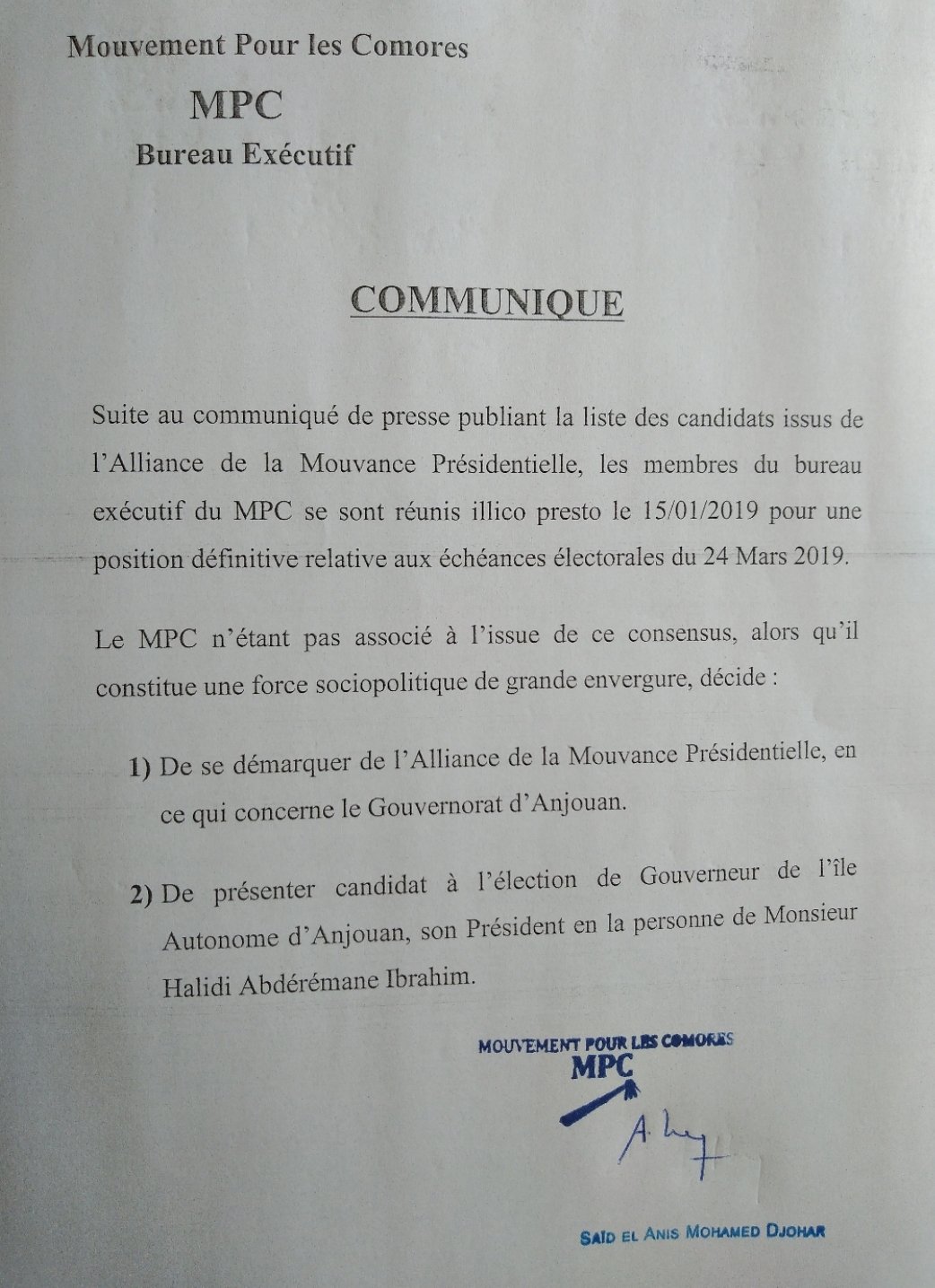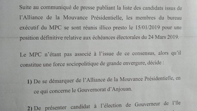 Le choix du candidat au poste de gouverneur d’Anjouan divise sur l’île. Le mouvement pour les Comores conteste le choix de la mouvance présidentielle et présente un candidat au poste de Gouverneur.