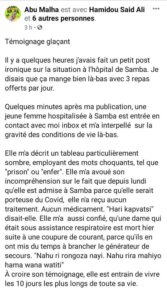 Elle lui a aussi expliqué qu »elle était témoin oculaire d’une femme qui était sous assistance respiratoire décédée quelques temps après la coupure du courant:<< Elle m’a décrit un tableau particulièrement sombre, employant des mots choquants, tel que « prison » ou « enfer ». Elle m’a avoué son incompréhension sur le fait que depuis lundi qu’elle est admise à Samba parce qu’elle serait porteuse du Covid, elle n’a reçu aucun traitement. Aucun médicament. « Hari kapvatsi » disait-elle. Elle m’a aussi confié, qu’une dame qui était sous assistance respiratoire est mort hier suite à une coupure de courant, parce qu’ils en ont mis du temps à brancher le générateur de secours. « Nahu ri rongoza nayi. Nahu rira mahiyo hama wana watiti »