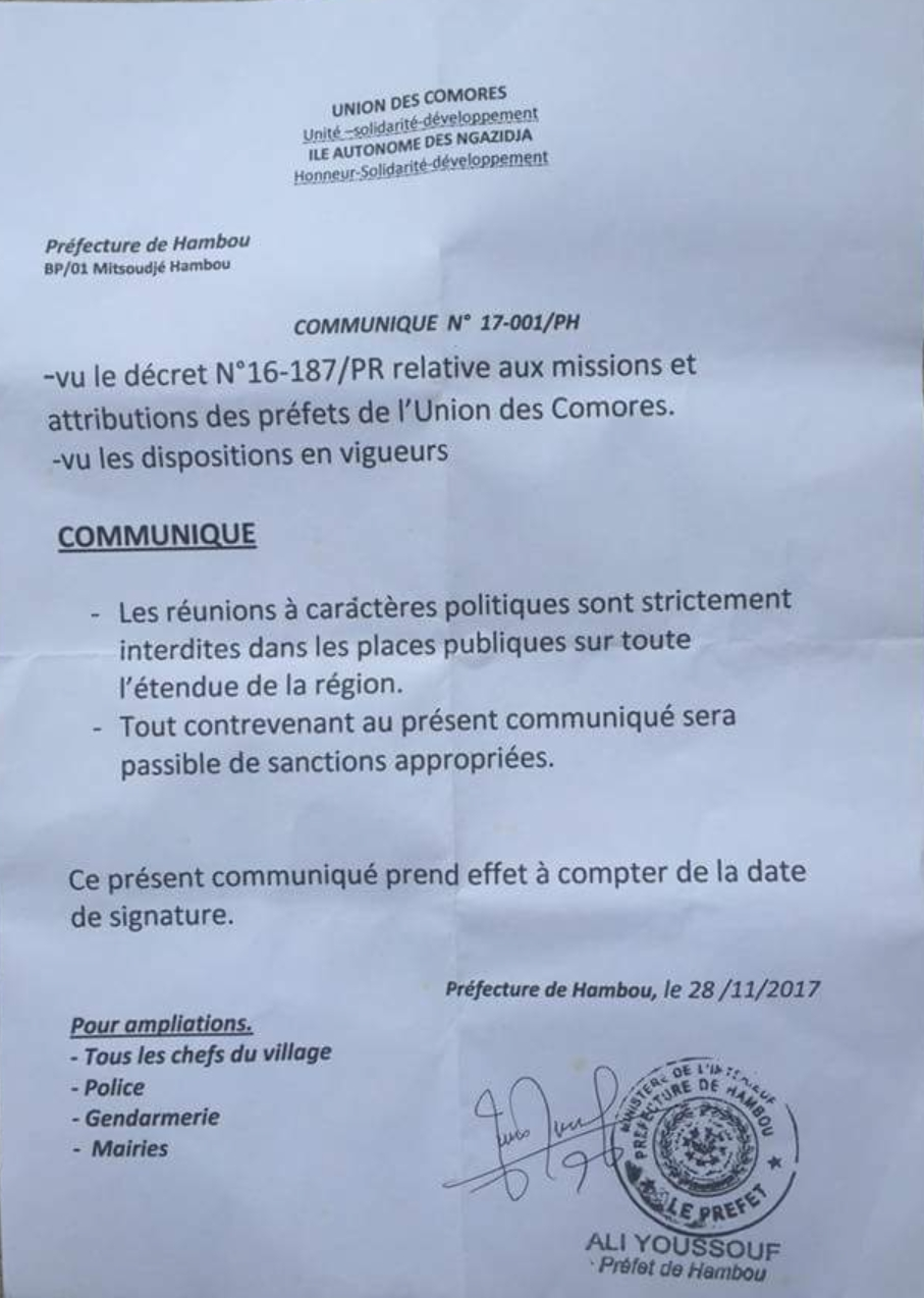 Comment le pays tombe si bas. On l’a dit et on le redit encore. On tombe si bas. Si l’honorable préfet suit les instructions de l’Etat, c’est bien normal étant le représentant de l’Etat dans la région. Pas de problème. Mais qu’il sache que »le communiqué » est illégal sur toute la ligne.