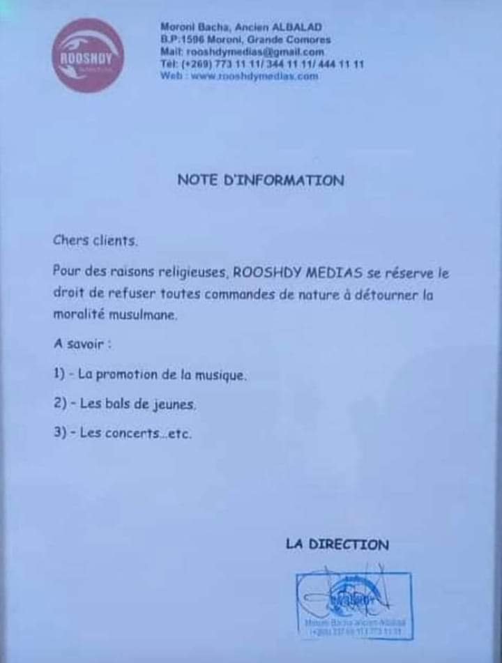 Rooshdy Médias, une agence d’impression et de communication basée à Moroni refuse désormais de faire le travail de tout ce qui va à l’encontre de l’Islam.