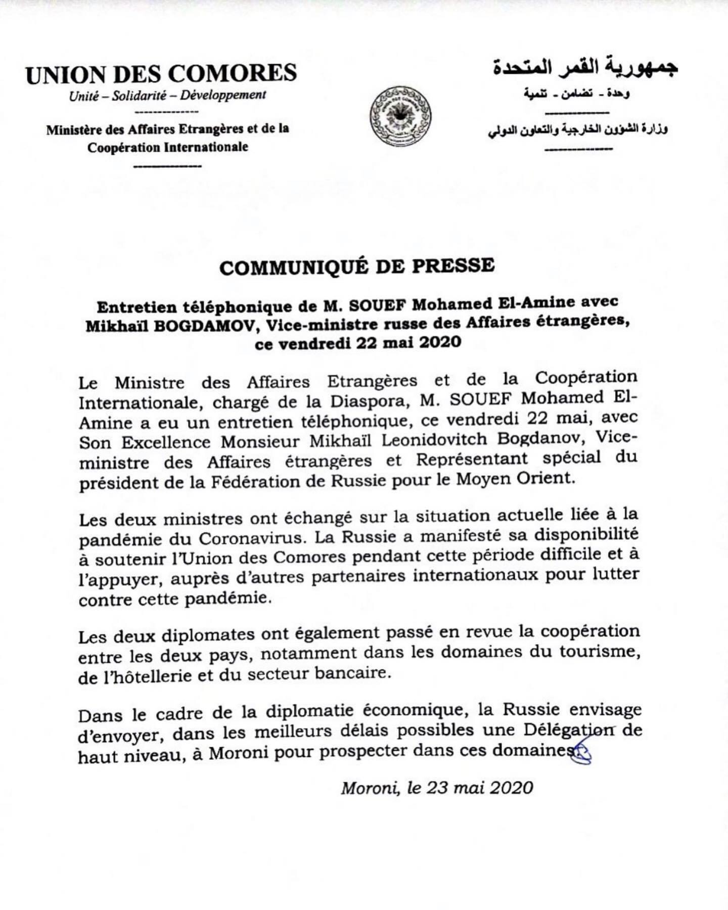 DIPLOMATIE : Dans le cadre de la diplomatie économique, la Russie envisage d’envoyer, dans les meilleurs délais possibles une délégation de haut niveau, à Moroni pour prospecter dans les domaines clés.