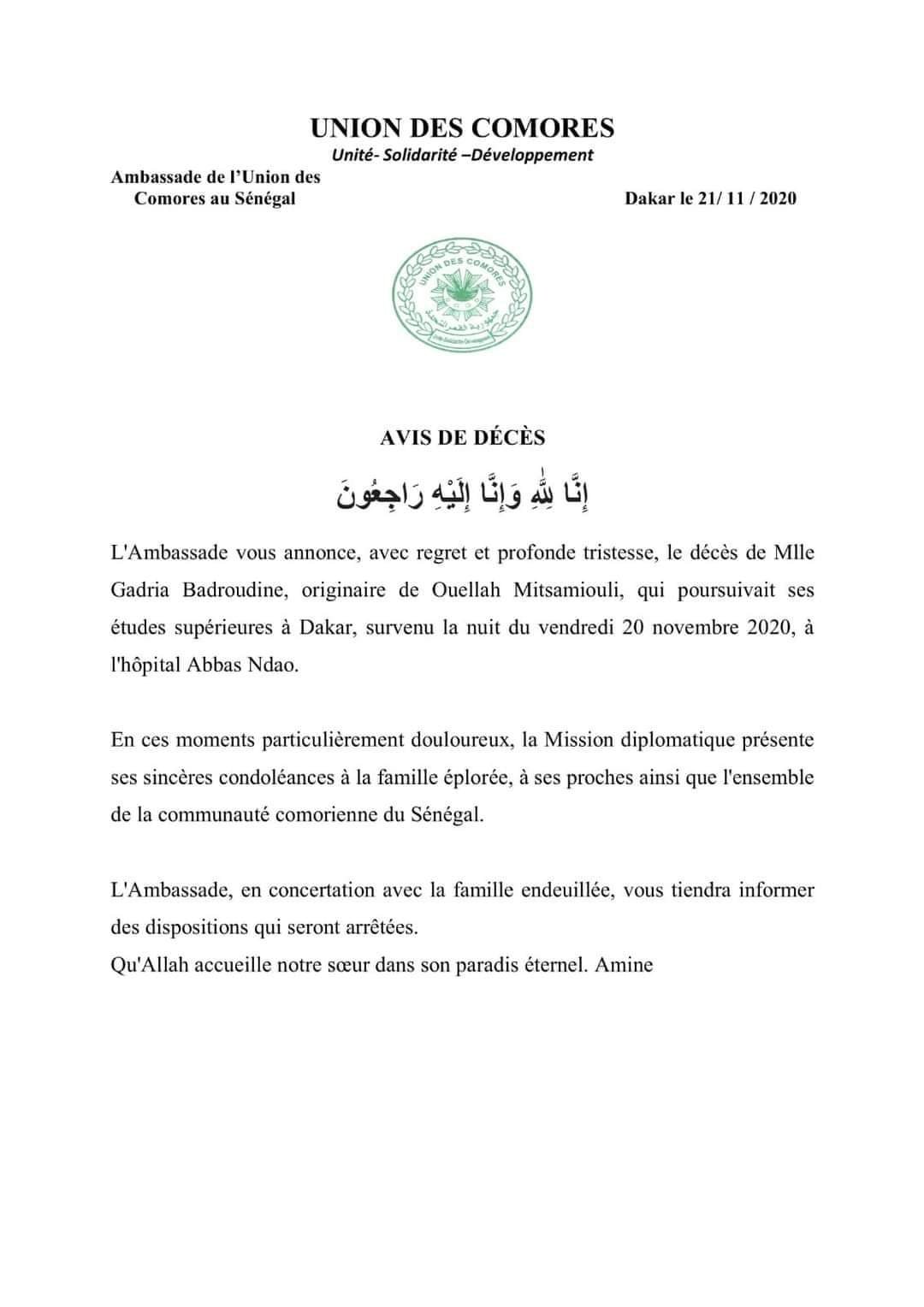 La communauté estudiantine comorienne au Sénégal est en deuil. Une étudiante est décédée ce vendredi 20 novembre. Elle s’appelle Gadria Badroudine originaire de Ouelah Mitsamihouli.