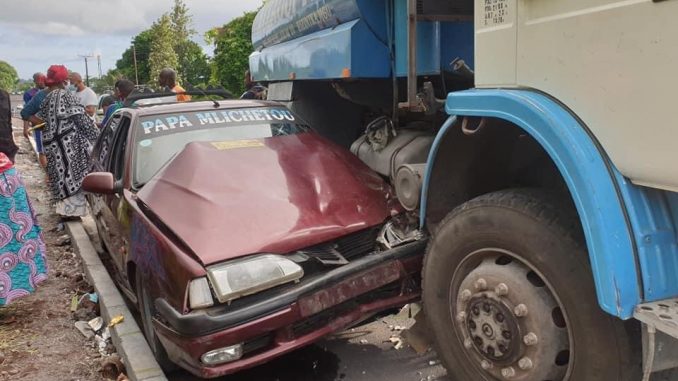 La Renault 19 est provenu de Vouvouni. Le chauffeur qui roulait beaucoup trop vite n’a pas eu le temps de freiner quand là camion-citerne sorti du château d’eau avait déjà engagé la voie. Nous ignorons le bilan de cet accident